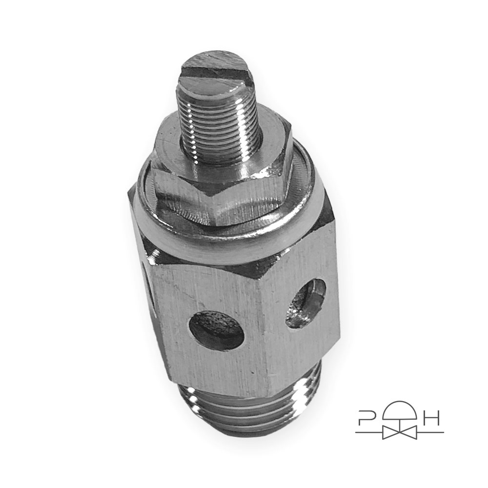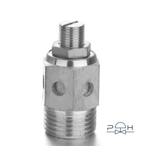 Fully adjustable 1/4″ NPT stainless steel exhaust muffler throttle valve used for vent speed control.