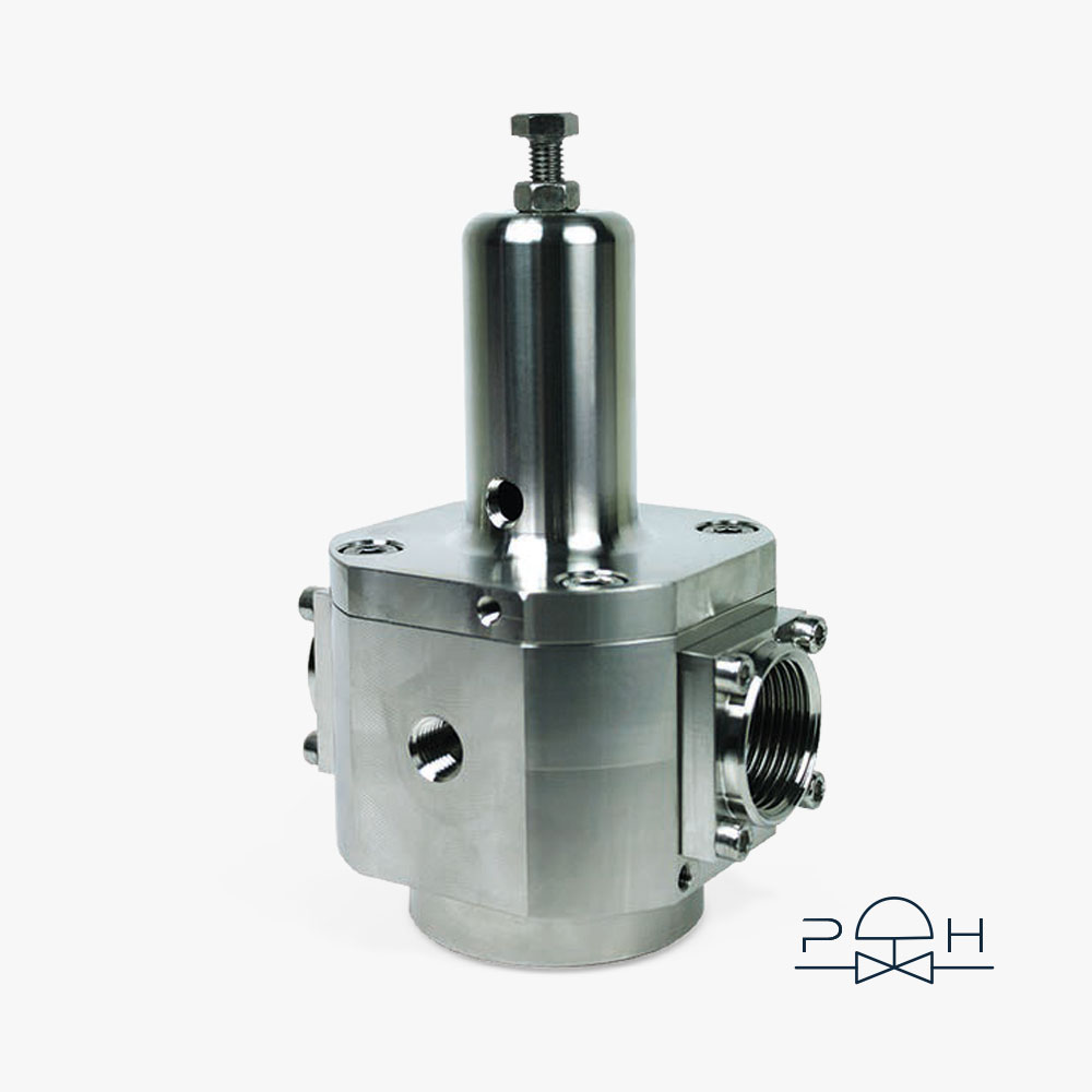 Pressure Regulators made of stainless steel 316 L designed and manufactured for heavy-duty applications. Control system with convoluted diaphragm for the best stability and precision. Balanced poppet-valve (shutter) to keep the outlet pressure almost constant and independent from fluctuation of inlet pressure. Self-relieving execution for exhausting over-pressure, just for compressed air application. Outlet pressure range till to 50 bar (725 psi). Adjusting by screw with hex. head. Connections for outlet pressure gauge on both the sides Special version (i.e. no self-relieving for gases and liquid) on requires.