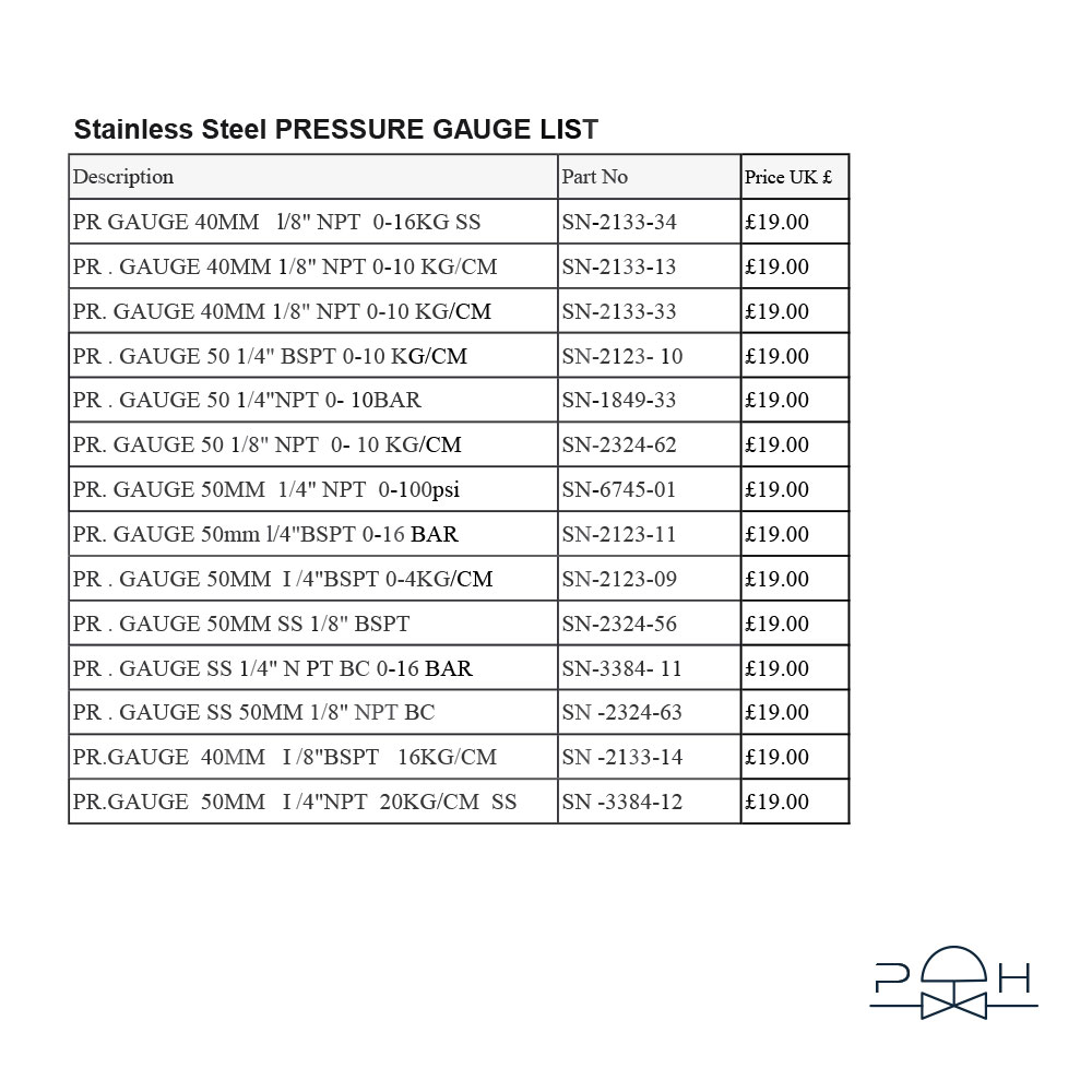 Various models of 40mm and 50mm diameter, BSPT or NPT, Mild Steel Case or Full Stainless Steel Construction.